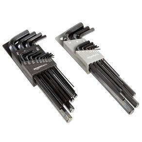 - Conjunto de 22 peças de chaves hexagonais de braço longo (também conhecidas como chaves Allen) para apertar ou soltar fixadores; inclui tamanhos SAE e métricos; ideal para trabalhar em bicicletas, motocicletas, veículos, móveis, máquinas e muito mais