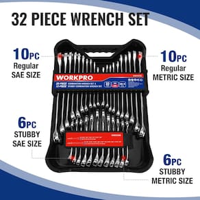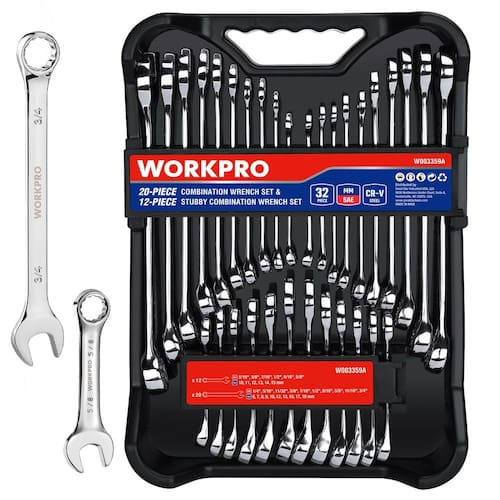 WORKPRO Conjunto de chaves combinadas SAE e métricas de 32 peças, 20 chaves padrão e chaves de 12 peças com bandeja organizadora, espelho de aço Cr-V polido - Chave eficiente: estas chaves combinadas são configuradas com uma extremidade de caixa de 12 pontos, que dobra o ângulo de acesso para um 6 pontos, a abertura da extremidade da caixa é projetada para segurar lados planos das cabeças de fixação, não cantos para evitar arredondamento - Feito para durar: este conjunto de chaves de engrenagem é forjado em aço cromo vanádio de alta qualidade; a superfície é galvanizada com cromo brilhante e polido espelhado para evitar corrosão e oxidação, o que prolonga a vida útil; a dureza da chave de até HRC 50 torna a chave capaz de suportar mais força - Conjunto de chaves de alta qualidade de 32 peças: 10 peças SAE- 1/10.2 cm, 5/40.6 cm, 11/81.3 cm, 3/20.3 cm, 7/40.6 cm, 1/5.1 cm, 9/40.6 cm, 5/20.3 cm, 11/40.6 cm, 3/1 2 mm e 10 peças métricas - 6, 7, 8, 9, 10, 12, 13, 15, 17, 18 mm; 6 peças Stubby SAE- 5/40.6 cm, 3/20.3 cm, 7/40.6 cm, 1/5.1 cm, 9/40.6 cm, 5/20.3 cm e 6 peças Métrica atarracada - 10, 11, 12, 13, 14, 15 mm. Uma ampla variedade de ferramentas para os melhores resultados possíveis - Organização portátil: o conjunto de chaves inglesas vem com uma bandeja de organização premium para facilitar o transporte e pendurar; a embalagem mínima ajuda as chaves a se manterem organizadas e permite acesso rápido sem volume, e pode caber na maioria das gavetas de ferramentas - Versátil: os conjuntos de chaves combinadas WORKPRO podem lidar com qualquer coisa, desde reparos de automóveis e motocicletas até manutenção doméstica, manutenção de bicicletas e engenharia de garagem. São perfeitas para qualquer projeto de bricolage, pequeno ou grande
