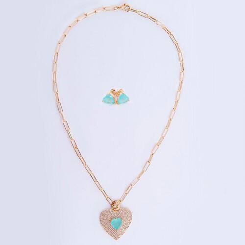 Conjunto composto de colar e um par de brincos com pingente em formato de coração, banhado a ouro com pedras fusion e microzircônias cristais. É luxuoso que te deixa em destaque em qualquer situação.