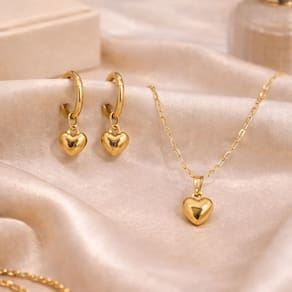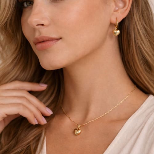 O colar possui corrente fina e confortável, com caimento leve no pescoço e pingente central de coração. Os brincos são do modelo argola com pingente removível em formato de coração, garantindo versatilidade e charme ao look.