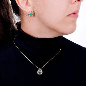Conjunto de colar e brincos banhado a ouro com pedra fusion esmeralda colombiana e zircônias coloridas é luxuoso que te deixa em destaque em qualquer situação.