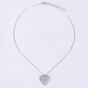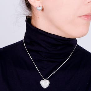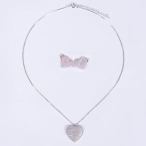 O Conjunto composto de colar em malha com pingente e brincos em formato de coração cravejado de microzircônias cristais, em ródio branco, delicado e luxuoso que lhe deixa em destaque em qualquer situação.
