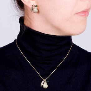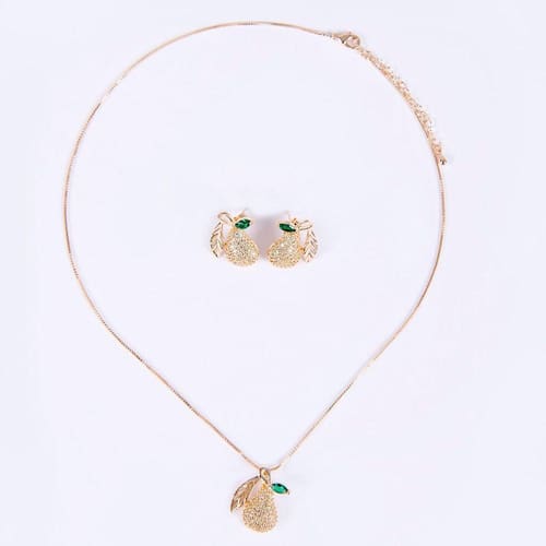 O Conjunto é composto de um colar com pingente e brincos em formato de pera, banhado a ouro, com zircônia esmeralda e microzircônias cristais. É delicado e luxuoso que te deixa em destaque em qualquer situação.