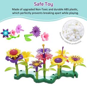 Segurança para seus filhos, este conjunto de brinquedos de arranjo floral é feito de plástico ABS, sem revestimento externo. Este conjunto de brinquedos infantis é seguro para seu filho e para o meio ambiente. O pacote inclui: 8 bases, 38 peças de caule e folha, 52 peças de flores.