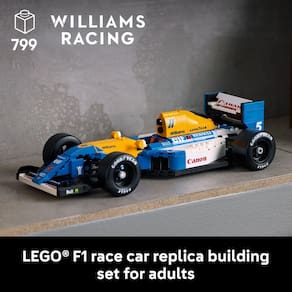 - Características e funções realistas – Este modelo de carro de corrida Williams Racing FW14B F1 da LEGO Icons apresenta direção funcional, pneus traseiros amplos com letras Goodyear impressas, além de um motor detalhado