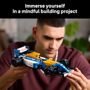 - Conjunto de montar modelo – Tudo o que você precisa para construir um carro de corrida LEGO F1 Williams Racing FW14B e uma minifigura de Nigel Mansell, além de um suporte de exibição, pódio, capacete de motorista e troféu