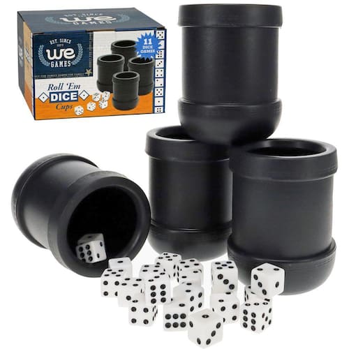 - ROLL EM: Conjunto de 4 copos de dados de plástico preto idênticos com 20 dados brancos, 5 para cada copo. Você pode aprimorar todos os seus jogos de dados fornecendo a cada jogador sua própria taça de dados individual. Esses copos de dados são tradicionais e fazem barulho, o que aumenta a diversão.