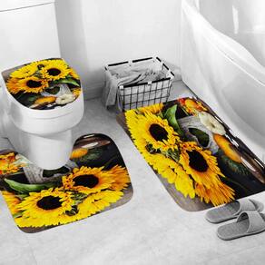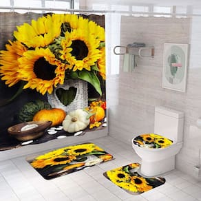 Tamanho do tapete antiderrapante: 45* 39 cm; tamanho do tapete de banho: 75* 45 cm; tamanho do assento do vaso sanitário: 38* 42 cm; tamanho da cortina de chuveiro: 180* 180 cm; peso: 800 g; material: poliéster; cor: igual à primeira foto; pacote: 1 tapete antiderrapante, 1 tapete antiderrapante de banheiro, 1 x assento de vaso sanitário, 1 x cortina de chuveiro. Design divertido de girassol — Apresenta um tapete antiderrapante de banheiro impressão digital de girassóis, abóboras e flores, trazendo uma atmosfera divertida e luminosa à decoração do seu banheiro. Material de poliéster durável — Feito de tecido de poliéster de alta qualidade que é impermeável e duradouro, garantindo proteção para seu banheiro com o uso diário. Conjunto de banheiro completo — Inclui uma cortina de chuveiro de 180 × 180 cm, um tapete de banho antiderrapante (45 × 75 cm) e uma tampa de vaso sanitário (38 × 42 cm) para proporcionar uma aparência coordenada e elegante. Impermeável e fácil de cuidar — Projetado para evitar respingos de água e, ao mesmo tempo, ser lavável na máquina para facilitar a manutenção, oferecendo conveniência para famílias ocupadas. Perfeito para banheiros domésticos e de hóspedes — Ideal para adicionar um toque alegre e vibrante a qualquer banheiro, seja em sua casa ou em um banheiro de hóspedes, com seu design arrojado e colorido.