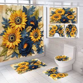 Tamanho do tapete antiderrapante: 45* 40 cm; tamanho do tapete de banho: 75* 45 cm; tamanho do assento do vaso sanitário: 38* 42 cm; tamanho da cortina de chuveiro: 180* 180 cm; peso: 710 g; material: poliéster; cor: igual à primeira foto; pacote: 1 x tapete antiderrapante, 1 x tapete antiderrapante de banheiro, 1 x assento de vaso sanitário, 1 x cortina de chuveiro Tecido de poliéster de alta qualidade: feito de poliéster durável, esta cortina de chuveiro foi projetada para suportar o uso diário e é resistente à umidade, ajudando a manter seu banheiro limpo e fresco. Design vibrante de girassol e floral: apresenta uma linda estampa floral em 3D de girassóis e rosas azul-marinho, adicionando um toque aconchegante e elegante à decoração do seu banheiro. Impermeável e resistente ao mofo: revestido com uma camada impermeável que ajuda a evitar que a água penetre, ao mesmo tempo que resiste ao mofo, garantindo um ambiente de banheiro seco e limpo. Conjunto completo de banheiro de 4 peças: inclui uma cortina de chuveiro (180 × 180 cm), tapete de banho antiderrapante, tampa de vaso sanitário e tapete, todos com o mesmo design floral para uma aparência coordenada e elegante. Fácil de instalar e cuidar: o conjunto de cortinas de chuveiro vem com ganchos reforçados para facilitar a suspensão e é lavável à máquina, facilitando a manutenção.