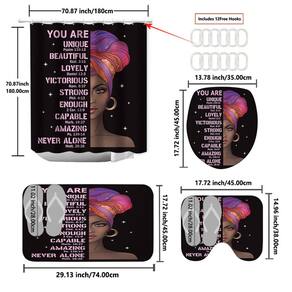 Tamanho do tapete antiderrapante: 45* 38 cm; tamanho do tapete de banho: 74* 45 cm; tamanho do assento do vaso sanitário: 35* 45 cm; tamanho da cortina de chuveiro: 180* 180 cm; peso: 700 g; material: poliéster; cor: igual à primeira foto; pacote: 1 tapete antiderrapante, 1 tapete antiderrapante de banheiro, 1 x assento de vaso sanitário, 1 x cortina de chuveiro Material de poliéster durável: feito de tecido de poliéster de qualidade que oferece cortina lisa, desempenho de secagem rápida e proteção confiável à prova d'água para uso diário no banheiro. Design artístico arrojado: apresenta uma impressionante ilustração feminina africana com um lenço colorido e texto afirmativo, adicionando caráter e personalidade modernos à decoração do banheiro. Conjunto funcional de 4 peças: inclui uma cortina de chuveiro de 180 × 180 cm, tapete antiderrapante, tapete de banho e tampa de vaso sanitário, projetado para combinar uma configuração de banheiro coesa e elegante. Suporte antiderrapante: Ambos os tapetes possuem suporte antiderrapante para ajudar a reduzir o deslizamento em superfícies secas, oferecendo mais estabilidade durante as rotinas diárias. Fácil instalação e manutenção: vem com ganchos para uma configuração simples, e o tecido de poliéster é fácil de limpar e manter, ideal para apartamentos, dormitórios e banheiros domésticos.