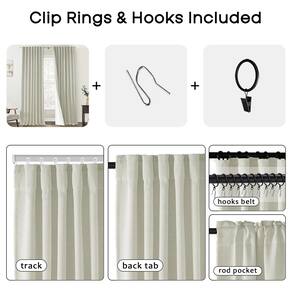 - Suspensão em 3 vias: 1) Aparência plissada contemporânea (não prega de aperto) - Com anéis pretos e ganchos na fita traseira do cabeçalho da cortina no sistema de trilhos ou haste de cortina combinando. 2) Visual moderno com aba traseira – com laço oculto pendurado no varão de cortina escondendo ferragens. 3) Visual simples de clipes casuais: Basta usar clipes no cabeçalho da cortina.