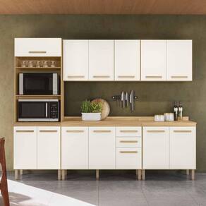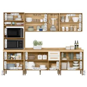 Modelo: Conjunto de Armários Celeste; Altura: 212,5 cm; Largura: 270 cm; Profundidade Superior: 28 cm; Profundidade Inferior: 53 cm; Material da estrutura: MDP; Quantidade de portas: 13, sendo 1 basculante com bastão a gás; Material de dobradiças: Metálicas; Quantidade de gavetas: 02; Material da corrediça: telescópicas; Com puxador: Sim, MDF; Quantidade prateleiras: 05; Pés com regulagem: Sim; Peso suportado do Paneleiro: até 70 kg distribuídos; Peso suportado dos balcões: até 82 kg distribuídos; Peso suportado dos aéreos: até 43 kg distribuídos; Requer montagem: Sim (kit montagem incluso); Embalagem do envio: Papelão e plástico;