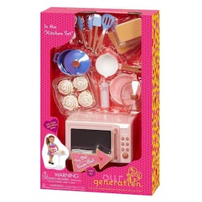 Conjunto de cozinha com micro-ondas para bonecas de 46cm! Prepare uma diversão saborosa com este conjunto Our Generation! O complemento perfeito para a cozinha da sua pequena chef, o acessório de micro-ondas fofo possui luz e som divertidos para aquecer deliciosas refeições basta colocar o recipiente de comida dentro e pressionar o botão! Uma espátula, colheres medidoras e uma garrafa de glacê permitem que suas amigas assem deliciosos pãezinhos de canela para um doce café da manhã ou uma sobremesa após a refeição. E as panelas e frigideiras ajudarão a preparar banquetes gourmet para seus convidados. Há sempre uma deliciosa surpresa esperando na cozinha! Acessórios faz de conta. Bonecas vendidas separadamente.