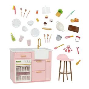 Onde as criativas chefs vão adorar brincar! Incrível cozinha com peças realistas, bancada de mármore, pia com torneira, gavetas e máquina de lavar louça. Emite 3 sons de lavagem de louça. Inclui mais de 30 peças. (Bonecas vendidas separadamente)