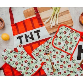 - CONSTRUA SEU ESPAÇO PERFEITO: prepare algo delicioso com este conjunto de cozinha Minecraft. Vem com um avental de cozinha correspondente, luva de forno, porta-panelas e 2 panos de cozinha com o icônico bloco TNT.