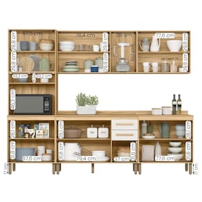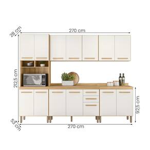 Modelo: Conjunto de Armários; Altura: 212,5 cm; Largura: 270 cm; Profundidade Superior: 28 cm; Profundidade Inferior: 53 cm; Material da estrutura: MDP; Quantidade de portas: 14; Material de dobradiças: Metálicas; Quantidade de gavetas: 02; Material da corrediça: telescópicas; Com puxador: Sim, MDF; Quantidade prateleiras: 05; Pés com regulagem: Sim; Peso suportado do Paneleiro: até 58 kg distribuídos; Peso suportado dos balcões: até 82 kg distribuídos; Peso suportado dos Aéreos: até 43 kg distribuídos; Requer montagem: Sim (kit montagem incluso); Embalagem do envio: Papelão e plástico;