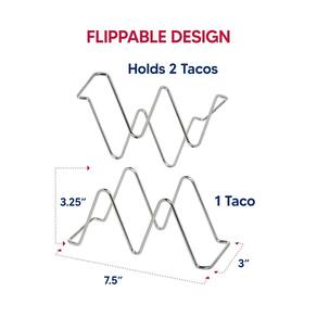 - O recurso exclusivo de flip segura um único taco de um lado e vira para segurar dois tacos do outro; chega de fazer malabarismos com cascas de taco e derramar ingredientes
