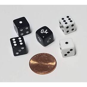 Dados de gamão muito pequenos, incluindo um cubo duplo de 10 mm. Outros dados são 2 dados pretos e 2 brancos padrão de 6 lados, mas também são muito pequenos. Veja a imagem para referência (centavo não incluído).
