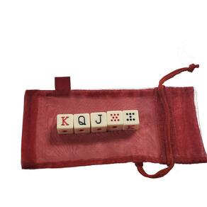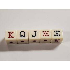 Poker Dice é um jogo de dados que usa cinco (5) dados especiais que têm valores de cartas de baralho de nove a ás, em vez de 1 a 6 pontos nos dados padrão. Os dados de pôquer podem ser jogados por qualquer número de jogadores e as regras do jogo são muito simples. Cada jogador, por sua vez, recebe até três jogadas de dados para fazer a melhor mão de pôquer padrão, os jogadores colocam os dados de lado em cada lançamento para construir a “mão” e o jogador com a melhor mão de pôquer ganha (o naipe não tem relevância). Uma variante dos dados de pôquer, os dados mentirosos permitem blefar. Cada jogador protege seus lances e anuncia sua mão, com sinceridade ou não. O segundo tenta uma mão melhor ou descarta o blefe. Se o chamador estiver correto em sua chamada, ele ganha; se não, ele perde. Objeto de valores de mão: Para obter a mão mais alta, esse é o maior número da carta de maior valor. A mão mais alta possível é de 10 reis. Valor: Ace/Wild = 1 ponto King = K Queen = Q Jack = J 8 = 8 Dots 7 = 7 dots Jogando: Cada jogador lança um dado. High roll vai primeiro e o play se move para a esquerda. Um jogador lança todos os cinco dados e deixa de lado os dados que deseja salvar. O jogador então lança novamente os dados restantes, se houver. Se o jogador tiver cinco dados do mesmo tipo no final da primeira ou segunda jogada, o jogador pode rolar novamente todos os cinco dados uma vez e adicionar qualquer dado correspondente ao total anterior. Na primeira jogada do jogador, o ás é selvagem e pode ser para igualar qualquer dado. Na segunda ou terceira jogada dos dados, um ás só conta como wild se outro dado correspondente à primeira jogada for lançado. Na jogada extra do dado, depois de um 5 de um tipo, o ás só conta como wild se outro dado correspondente à primeira jogada for lançado