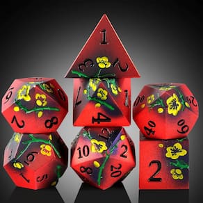 B0D93B6YQZ - Conjunto de dados de metal de flores: um conjunto de dados de flores no total de 7 peças, incluindo D4, D6, D8, D10, D12, D20 e D%. - Material: Feito de liga de zinco, cada molde tem revestimento durável que permite que você jogue com confiança e autoridade. - Cor: Dados de metal vermelho e amarelo com duas cores que prometem um efeito deslumbrante, que certamente se destacará na mesa, o design é perfeito para o personagem D&D. - Peso: o peso líquido completo é de 148 g. Atualize seu jogo de dados com este conjunto pesado. - Pacote: Linda caixa de metal para presente com forro de espuma decorada com um lindo dragão e matriz. - Uso: os dados são perfeitos para RPGs como Dungeons and Dragons, Shadowrun, Pathfinder, Savage World, Warhammer, Yahtzee e muitos outros RPG e jogos de cartas.