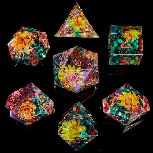 DND Shiny Star & Flowers, conjunto de dados DND feito à mão com 7 acessórios Sharp Edge Dice para jogos TTRPG de Dungeons and Dragons, RPG multifacetado, resina poliédrica, jogos de RPG Sharp Edge Dice - ??RESINA NATURAL FEITA À MÃO?Contém 7 unidades de dados por conjunto, inclui caixa de presente, D4, D6, D8, D10, D12, D20 e D%. Todos feitos à mão com qualidade premium garantida. - ??SHARP EDGE DICE?Cada dado afiado de resina é lixado e polido manualmente para manter suas belas bordas afiadas. - ??FÁCIL DE LER?Preenchido com resina natural. Apresentado de forma cristalina por fora e por dentro, com números grandes e fáceis de ler, o tamanho é um padrão comum de dados de D&D no mercado. - ??MULTIUSO?perfeito para jogos de RPG e MTG, como Dungeons and Dragons, Savage World, Warhammer, Yahtzee e Pathfinder. - ??COMPROMISSO DE SATISFAÇÃO?Garantimos a qualidade de nossos produtos. Se por algum motivo você não estiver satisfeito com sua compra. Nós devolvemos o dinheiro em 90 dias.