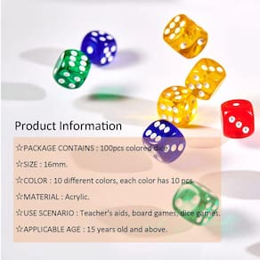 -?QUANTIDADE?100 dados coloridos e transparentes de 6 lados, existem 10 cores diferentes, cada cor tem 10 dados.