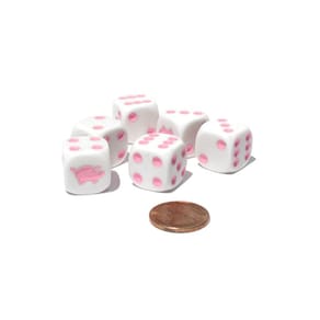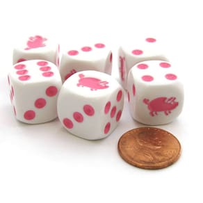 Esses dados de porco de 16 mm têm bordas arredondadas bonitas e lisas que proporcionam uma ótima sensação e rolagem. Eles são numerados de 1 a 6 com pontos e pontos tradicionais, gravados na superfície dos dados e pintados de rosa. Um porco é gravado no lado onde tradicionalmente estaria localizado o 1 caroço, o “ás”. Use esses dados de porco para jogar seus dados e jogos de tabuleiro favoritos ou criar seu próprio jogo. 6 dados embalados em uma pequena sacola plástica conveniente que pode ser fechada novamente estão incluídos nesta compra.