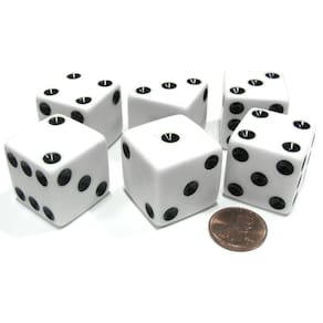 Esses dados grandes de 25 mm com seis lados e bordas quadradas são numerados de um a seis com pontos e pontos tradicionais, gravados na superfície do dado e pintados.