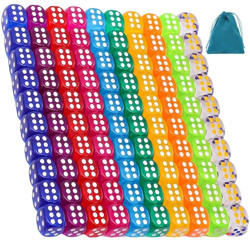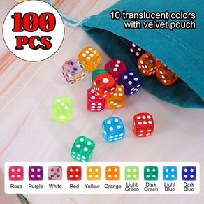 - 🎲 O pacote inclui: você receberá 100 dados de cores translúcidas, 10 de cada cor, o suficiente para seus vários jogos ou outras necessidades de entretenimento. Equo com bolsa de armazenamento de veludo, conveniente para manter os dados no mesmo local, evitando efetivamente a perda.