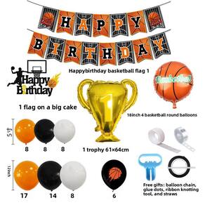 Kit completo de festa de basquete: inclui 12 balões de látex e alumínio com estampas de basquete, um banner de “Feliz Aniversário”, decorações de troféus e coberturas de bolo, tornando-o perfeito para qualquer festa com tema de basquete. Design inspirado no basquete: apresenta bolas de basquete, aros e troféus em um vibrante esquema de cores laranja, preto e branco, ideal para fãs de esportes ou entusiastas do basquete. Materiais de alta qualidade: feitos de papel alumínio durável e látex, esses balões e decorações são projetados para durar todo o evento, garantindo que sua festa com tema de basquete tenha uma aparência fantástica. Perfeito para eventos esportivos: este conjunto de decoração é perfeito para festas de aniversário, comemorações de dias de jogos e qualquer evento com tema esportivo, criando uma atmosfera energética e divertida. Configuração fácil: com tudo incluído, é muito fácil preparar sua festa de basquete, para que você possa se concentrar em aproveitar a celebração e passar o tempo com seus convidados.