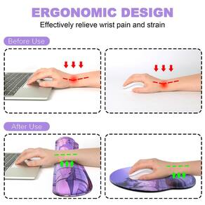 - Design ergonômico: este mousepad com apoio para o pulso se adapta à forma natural do pulso, aliviando a pressão e fornecendo suporte ideal ao pulso, garantindo uma experiência confortável de digitação ou jogo