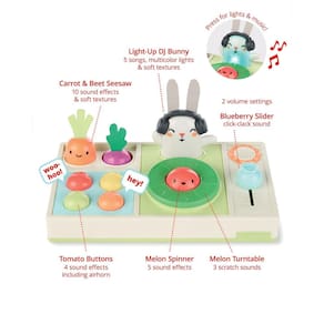 Repleto de mais de 30 recursos de jogo, incluindo um coelhinho DJ iluminado, músicas, sons e muito mais, nosso brinquedo musical para bebês dá início à festa e incentiva o bom motor habilidades, coordenação olho-mão e mais atividades de desenvolvimento de habilidades - Ajuda a incentivar habilidades motoras finas, coordenação olho-mão e brincadeiras de fingir; ajuda a ensinar causa e efeito - Light-Up DJ Bunny: 5 músicas, luzes multicoloridas e texturas suaves; Carrot & Beet Seesaw: 10 efeitos sonoros e texturas suaves
