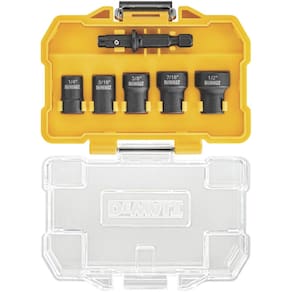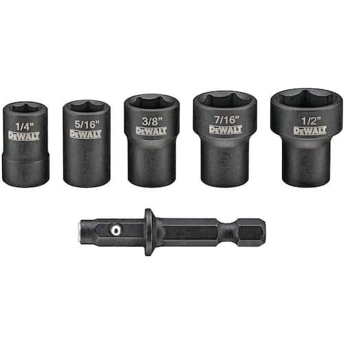 DEWALT Conjunto de chave de porca, destacável, 5 peças (DWADND5) - O design de chave de porca destacável permite que os usuários limpem os detritos, melhorando a vida útil geral - A haste sextavada da chave de porca de 0,63 cm é compatível com chaves de impacto, suportes de brocas de bloqueio e fixação de ângulo reto - A haste universal no conjunto de chaves de porca para furadeira aceita tamanhos de chave de porca destacáveis de 1/4 de polegada a 1/2 polegada - Projetado para uso em drivers de impacto