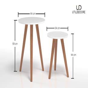 Mesa 1 Tampo de 44 cm Altura mesa 59 cm Tampo em MDF com espessura de 15mm Mesa 2 Tampo de 34 cm Altura mesa 44 cm Tampo em MDF com espessura de 15mm *Disponível na cor branca. Pés de madeira. Os pés são confeccionados em madeira e parafusados, assim tornando a montagem simples e rápida. *Disponível na cor Amêndoa claro.