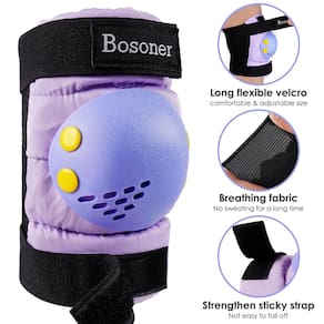 - Tecidos ventilados - O conjunto de joelheiras e cotoveleiras infantis BOSONER é feito de tecidos duráveis de alta qualidade, com acolchoamento de espuma EVA e tampas de policarbonato de cobertura total, que têm boa absorção de choque e efeito de amortecimento para reduzir os danos causados por quedas esportivas