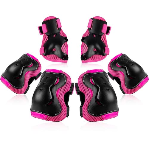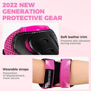 - Tecidos ventilados – o conjunto de joelheiras e cotoveleiras infantis BOSONER é feito de tecidos duráveis de alta qualidade, com enchimento de espuma EVA e tampas de cobertura total de policarbonato, que tem boa absorção de choque e efeito de amortecimento para reduzir os danos causados por quedas esportivas