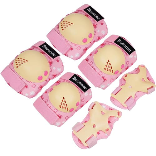 - Tecidos ventilados – o conjunto de joelheiras e cotoveleiras infantis BOSONER é feito de tecidos duráveis de alta qualidade, com acolchoamento de espuma EVA e tampas de cobertura total de policarbonato, que tem boa absorção de choque e efeito de amortecimento para reduzir os danos causados por quedas esportivas
