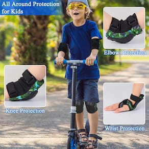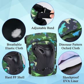 Marca: FIODAY Nome do produto: Joelheiras infantis 7 em 1 protetores de pulso com cotoveleiras conjunto de equipamentos de proteção com padrão de dinossauro Material: Revestimento de PP rígido e faixa de EVA respirável Detalhes de tamanho: Joelheiras: 16 x 14,5 cm cotoveleiras: 15 x 12,4 cm almofadas de pulso: 14,5 x 9,9 cm bolsa: 39,9 x 30 cm A embalagem inclui: 2 joelheiras. 2 cotoveleiras 2 protetores de pulso. 1 bolsa - Conjunto de equipamentos de proteção 7 em 1: o pacote inclui 2x joelheiras, 2x cotoveleiras, 2x protetores de pulso e 1x mochila com cordão; muito fácil de armazenar e carregar as almofadas de skate para qualquer lugar a qualquer momento e evitar perder qualquer um deles - Durável e confortável: o conjunto de joelheiras infantis é feito de revestimento de PP, que pode resistir a impactos; acolchoado com material EVA macio para amortecimento de impacto; forro de tecido respirável e design de superfície de malha fornecem um envolvimento respirável e confortável - Design de dinossauro fofo: estas almofadas de skate são projetadas com padrão de dinossauro atraente e fofo, que pode chamar a atenção de seus filhos; Ajuda a incentivar seu filho a praticar esportes; eles atrairão a atenção das pessoas, não importa onde seus filhos vão - Faixas elásticas ajustáveis: o tamanho pequeno é adequado para meninos de 3 a 8 anos, pesa 16 a 35 kg; as tiras elásticas ajustáveis garantem liberdade de movimento ao praticar esportes; as joelheiras e cotoveleiras são fáceis de usar; as crianças podem fazer isso sozinhas - Conjunto de equipamentos multiesportivos: as joelheiras e cotoveleiras infantis são muito adequadas para scooter, skate, mountain bike, patinação em linha, patinação, ciclismo e outros esportes; o conjunto de almofadas para crianças mantém nossos filhos longe de machucados quando gostam de esportes; é uma boa escolha como dia das crianças, Natal, aniversário, presente de feriado e outros presentes de festival.