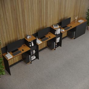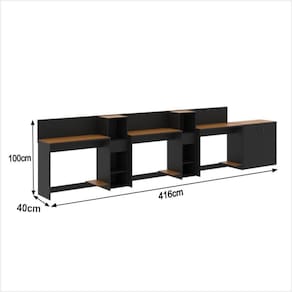 Altura da Mesa (cm): 74cm | Altura do Armário (cm): 99cm | Altura do Aparador (cm): 74cm | Largura da Mesa (cm): 91cm | Largura do Armário (cm): 33cm | Largura do Aparador (cm): 77cm | Profundidade da Mesa (cm): 38cm | Profundidade do Armário (cm): 28cm | Profundidade do Aparador (cm): 38cm | Altura dos Pés (cm): Não se aplica | Ambiente Principal: Escritório | Complexidade da Montagem: Média: pode ser montado por mais de uma pessoa e/ou necessite de maior conhecimento para montagem | Cor do Produto: Off White/Cedro | Cor Predominante: Off White | Cor Interna: Off White | Acabamento: Pintura UV | Acabamento da Gaveta: Pintura UV | Acabamento dos Pés: PVC | Escala de Brilho: Fosco | Escala de Brilho da Gaveta: Fosco | Garantia: 3 meses | Bandeja: Não | Estilo: Moderno | Itens Inclusos: 2 Livreiro, 1 Buffet, 3 Mesas, Manual de Montagem e Kits de Montagem | Linha ou Coleção: Tech | Inclui manual de montagem: Sim | Possui Portas: Sim | Possui Rodízio: Não | Marca: ViaNossa | Material da Gaveta: MDP/MDF | Material dos Pés: PVC | Cor: Preto e Cedro