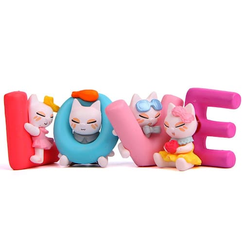 Material: PVC Tamanho: altura 3,8 cm, largura 3,2-4,8 cm Peso: 62 g ['Charming Cat Sculptures: este conjunto delicioso apresenta quatro gatos brincalhões interagindo com as letras “L”, “O”, “V” e “E”, adicionando um toque extravagante e divertido a qualquer espaço. ', 'Design de cores vibrantes: os gatos são retratados em cores vivas e alegres com acessórios divertidos, tornando este conjunto uma adição atraente à decoração de sua casa ou jardim. ', 'Material de PVC durável: Feitas de PVC de alta qualidade, essas estatuetas são leves e duráveis, perfeitas para ambientes internos e externos. ', 'Decoração versátil: ideal para decorar seu jardim, pátio, mesa ou qualquer cômodo da sua casa. Essas figuras de gatos adicionam um charme divertido e um toque criativo a qualquer ambiente. ', 'Perfeitas para amantes de gatos: indispensáveis para entusiastas de gatos, essas lindas estatuetas de gatos trazem alegria e personalidade ao seu espaço, tornando-as uma adição divertida e única à sua decoração']