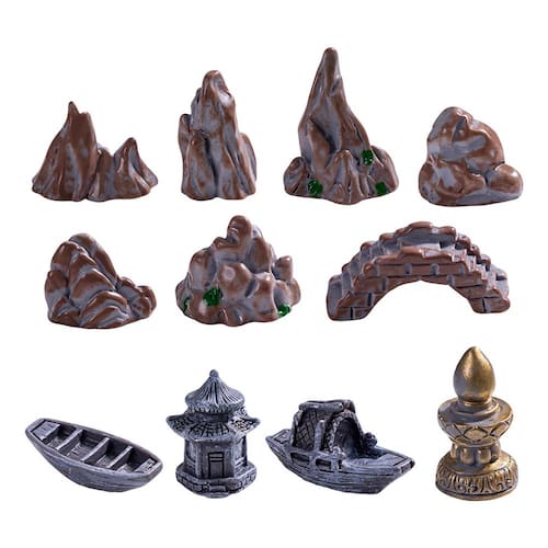 Material: Resina Tamanho: 0,9-3,2 cm Peso: 50 g ['Conjunto completo de paisagens em miniatura — Inclui montanhas rochosas realistas, uma ponte, barcos, um pavilhão e uma estátua de pagode, perfeita para criar decoração de jardim personalizada ou cenas de diorama. ', 'Artesanato em resina durável — Feita de resina de alta qualidade, cada figura de escultura é à prova d'água, resistente às intempéries e projetada para manter seus detalhes e cores para uso externo de longa duração. ', 'Detalhes realistas pintados à mão — Cada ornamento apresenta textura fina e detalhes pintados à mão, trazendo charme natural e profundidade a bonsai, jardins de fadas e paisagens de mesa. ', 'Uso decorativo versátil — Ideal para exibições de bonsai, terrários de musgo, aquários ou jardins em miniatura; também pode servir como decorações artísticas criativas de mesa ou prateleira. ', 'Compactas e fáceis de organizar — leves e pequenas (0,9—3,2 cm), essas estátuas de resina são fáceis de colocar, mover e combinar para possibilidades ilimitadas de design de jardim ou arte.']
