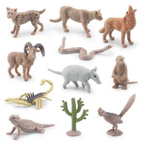 Conjunto de 11 peças de estatuetas de animais do deserto, bonecos de PVC, incluindo coiote, escorpião, cascavel, suricate, tatu, leão da montanha e cacto, brinquedos realistas da vida selvagem do deserto para crianças, decorações educacionais Descrição: Material: PVC Tamanho: 1,5 a 7 cm Peso: 40 g Características: Conjunto de estatuetas de animais do deserto: este conjunto apresenta 11 figuras de animais de PVC altamente detalhadas, incluindo coiote, escorpião, rã cobra, suricato, tatu, leão da montanha e cacto, projetados para imitar a verdadeira vida selvagem do deserto. Diversão educacional para crianças: perfeitas para ajudar as crianças a aprender sobre os ecossistemas do deserto, essas estatuetas são uma excelente ferramenta para brincadeiras educacionais, aprimorando o conhecimento sobre a vida selvagem e os animais do deserto. Ideal para exibir e brincar: esses animais do deserto em miniatura são ótimos para uso como brinquedos, decoração de quarto ou adições de diorama, tornando-os um conjunto versátil para crianças a partir de 3 anos. Seguros e duráveis: feitos de PVC não tóxico, esses bonecos são seguros para as crianças brincarem e construídos para resistir a horas de brincadeiras divertidas e criativas. Compacto e colecionável: cada boneco mede entre 1,5 cm a 7 cm, tornando-o fácil de coletar, armazenar ou exibir em uma variedade de configurações ou ambientes educacionais. O que vem na caixa: 11 x Conjunto de estatuetas de animais do deserto