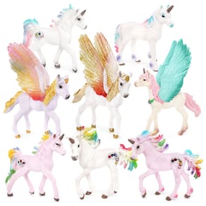 Conjunto de 8 peças de estatuetas de unicórnio mágico — unicórnios de PVC com asas coloridas, modelos de cavalos míticos para crianças, bonecos de animais fantásticos, brinquedos educativos, 7,5 a 10 cm Descrição: Material: PVC Tamanho: 7,5 a 10 cm Peso: 320 g Características: Design encantador: este conjunto inclui 9 estatuetas mágicas de unicórnio, cada uma com asas vibrantes e detalhes cintilantes, perfeitas para despertar a imaginação em mentes jovens. Seguras e duráveis: feitas de PVC não tóxico, essas estatuetas de unicórnio são feitas para durar e, ao mesmo tempo, garantir brincadeiras seguras para crianças de 3 anos ou mais. Fantasy Play: ideais para incentivar a narrativa criativa, essas figuras de unicórnio ajudam as crianças a explorar mundos de fantasia, desenvolver habilidades cognitivas e melhorar a coordenação olho-mão. Perfeitos para exibição: com suas asas coloridas e detalhes mágicos, esses modelos de unicórnio são uma adição encantadora a qualquer ambiente, seja para brincar ou como peça decorativa. Ideal para todas as idades: seja para crianças que amam unicórnios ou colecionadores de figuras fantásticas, este conjunto é perfeito para brincadeiras e exibições criativas. O que há na caixa: 8 x Conjunto de estatuetas de unicórnio mágico