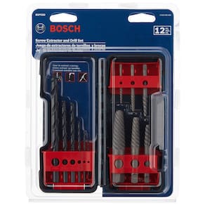 BOSCH BSPE6D Conjunto diverso de 12 peças de flauta espiral extrator de parafuso de aço de alto carbono e brocas de óxido preto ideais para remover parafusos, parafusos e fixadores descascados - Extratores de parafuso – utilizados para remover parafusos, parafusos e outros fixadores descascados - Flautas de mão esquerda – segure o metal firmemente - Aço carbono tratado termicamente – oferece durabilidade superior - Roscas enroladas – proporcionam mais precisão e são mais limpas do que roscas usinadas - Design resistente à ferrugem e manchas – oferece maior durabilidade e precisão