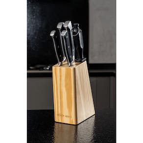 O conjunto inclui um elegante ceppo, que organiza as facas de forma prática e mantém sua cozinha sempre arrumada. Com um design moderno e compacto, ele se encaixa perfeitamente em qualquer espaço, combinando funcionalidade com estilo para complementar a decoração da cozinha.