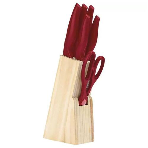 Conjunto de facas 7 pçs c suporte de madeira vermelha brinox