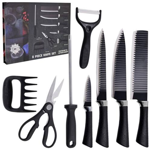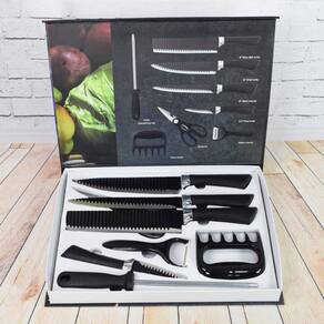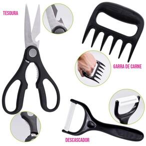 Itens inclusos: - 1 faca de corte de carne - 1 faca do chef - 1 faca de descascar - 1 descascador de legumes - 1 tesoura - 1 amolador de faca - 1 cutelo - 1 garra de carne Marca: Engarb