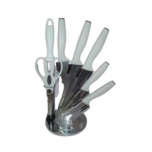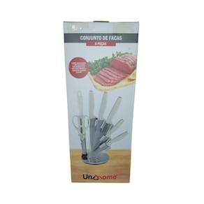 Conjunto De Facas 8 Peças Uny Home Conjunto de facas 8 peças uny home Mantenha sua cozinha segura e organizada com o kit de Facas da Uny Home.O suporte giratório com suportes inclináveis facilita a escolha e retirada das facas. As lâminas de aço inox são super resistentes e proporcionam cortes mais precisos. Os cabos de polipropileno são resistentes e tem empunhadura ergonômica que dão mais firmeza e corforto durante o corte. Contém: 1 Suporte giratório 1 Faca do chefe 10 1 Faca para carne 10 1 Faca para pão 10 1 1 Faca universal 7 1 Faca para frutas 7 1 Tesoura de cozinha 1 Chaira