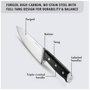 Afiadores de cerâmica embutidos afiam automaticamente facas de chef e outras facas de borda reta a cada uso Aço forjado, alto carbono, sem manchas facas para bife feitas de aço estampado Alças rotuladas para fácil identificação no bloco Alças rebitadas triplas são contornadas para uma aderência segura Full tang design para força e equilíbrio Marca: Não Informado
