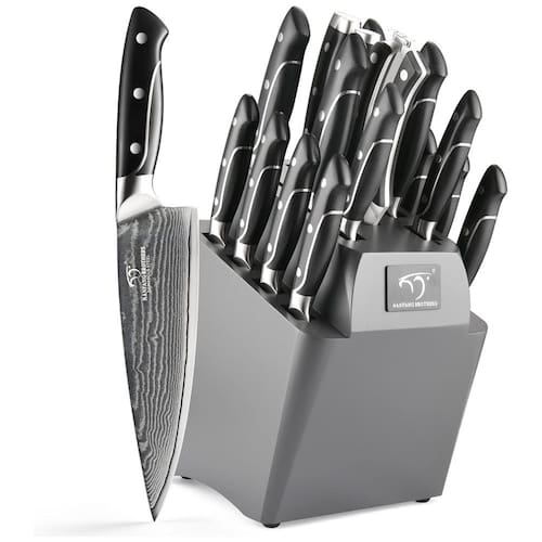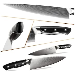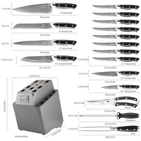 O conjunto profissional de facas de Damasco inclui uma faca de chef de 20,32 centímetros, faca de corte de 20,32 centímetros, faca de pão de 20,32 centímetros, faca Santoku de 17,78 centímetros, faca utilitária de 13,97 centímetros, faca de aparar de 8,89 centímetros, bife de 8 peças de 11,43 centímetros. Faca, garfo de carne de 27,94 centímetros, tesoura de cozinha, afiador de faca para ficar afiado e bloco de madeira natural As facas são fabricadas com núcleo de aço VG10 e 67 camadas de lâminas de aço Damasco superiores para precisão e exatidão. Dureza HRC 60 62 para nitidez excepcional e retenção de bordas. A alça de design curvo proporciona conforto e suporte O design integrado da lâmina e da haste não é fácil de quebrar, é e durável. Garante desempenho duradouro e é fácil de limpar. Você pode economizar muito tempo na limpeza A faca de bife tem serrilhas na lâmina e é afiada à mão a 15 graus, perfeita para cortar carnes e aves. Alta eficiência de corte, evita que os alimentos rasguem ou grudem na faca após o corte A parte do bloco de madeira é feita de Fraxinus Manchuria natural durável e as ranhuras para faca são mais fáceis de inserir e remover, seguras e higiênicas. Cada conjunto de facas é respaldado por qualidade superior e está sob rigorosa inspeção Marca: Não Informado